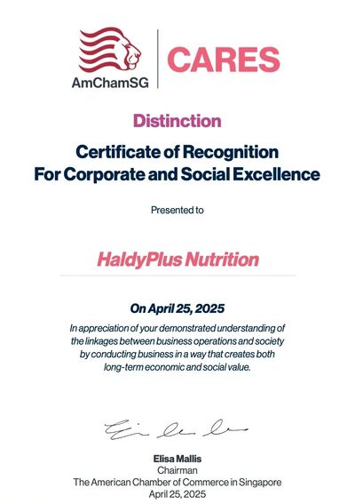 HaldyPlus Nutrition Pte Ltd. received the Distinction Certificate of Recognition for Corporate and Social Excellence (CSR), presented by AmChamSG.
